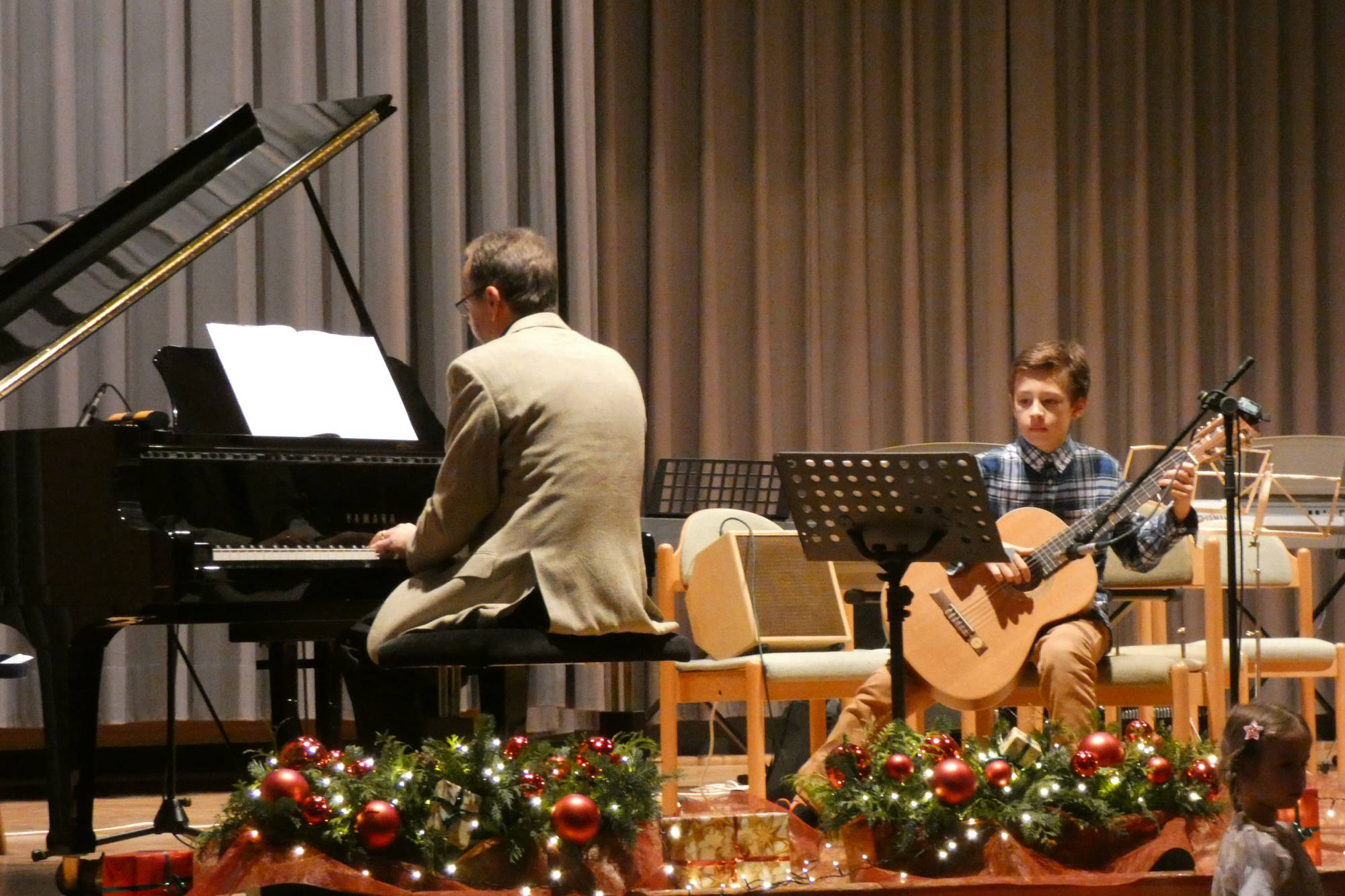 Am vergangenen Samstag feierte die Musikschule Rutesheim -1 . HHS in voll besetzter, weihnachtlich geschmückter Festhalle ihre Jahresabschlussfeier. Wir freuen uns ganz beson-ders, unsere neue Bürgermeisterin Frau Susanne Widmaier begrüßen zu dürfen. Das AkkO (Akkordeon-Orchester) unter der Leitung von Mihajlo Rajkovic eröffnete den Musikreigen mit weihnachtlichen Klängen, schmissigen Ohrwürmern und aktuellen Hits. Unter dem Motto „Weihnachten in aller Welt“ zeigten viele Schüler, angefangen bei den Kindern der rhythmisch musikalischen Früherziehung (Musimo), über Flöten-, Gitarren-, Keyboard- und Klavierspieler bis hin zu Schüler der Akkordeon-AG wie in verschiedensten Ländern Weihnachten gefeiert wird. Mit einem ganz bunten abwechslungsreichen Programm erfreuten die Musikanten die zahlreichen Gäste, die dies mit anhaltendem Applaus belohnten.