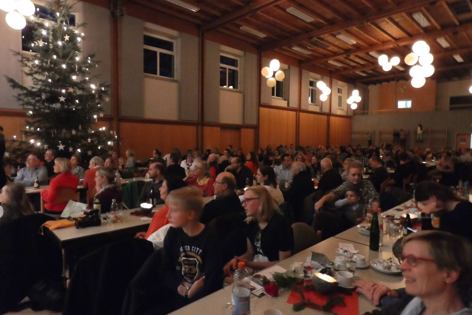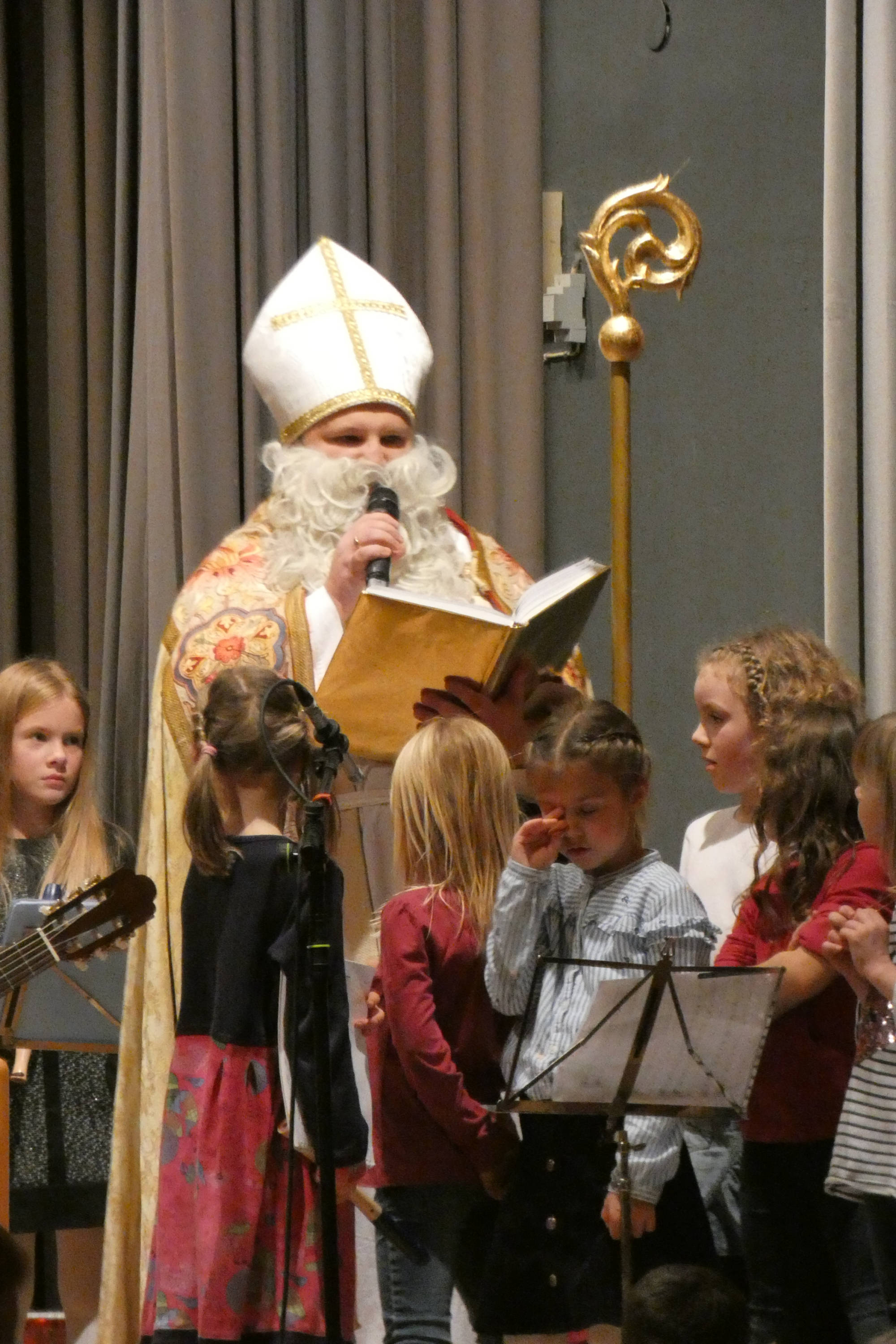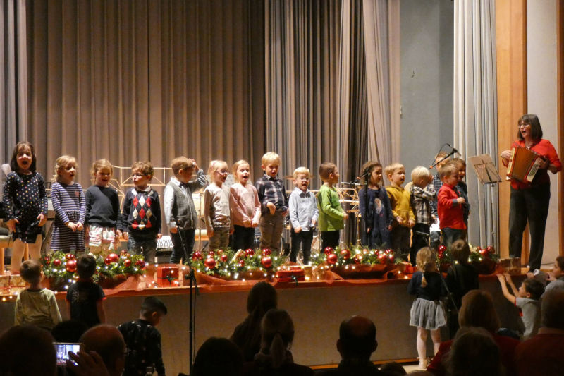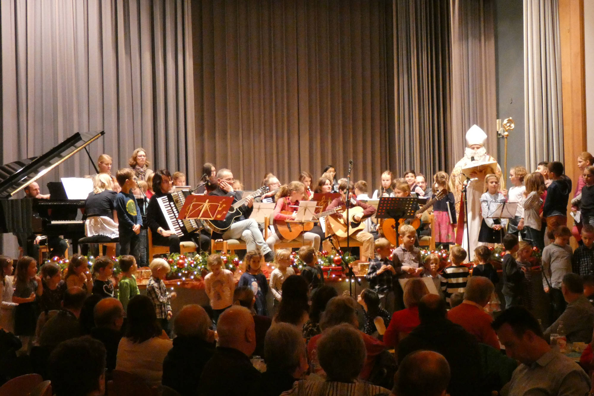 Auch der Nikolaus hatte sein Kommen angekündigt und wurde „Am Weihnachtsbaum die Lichter brennen“ begrüßt. Die Kinderaugen wurden immer größer, sie konnten es kaum er-warten, bis er zur Bühne kam. In Gedichtform ließ er das Vereinsjahr Revue passieren, lobte und dankte Schüler, Lehrer und ehrenamtliche Helfer für ihren großen Einsatz im vergange-nen Jahr. Nach dem gemeinsamen Lied „Stille Nacht, Heilige Nacht“ duften die Kinder ihre Nikolausgeschenke in Empfang nehmen. Auch die Saalkinder wurden mit einem kleinen Ge-schenk bedacht.